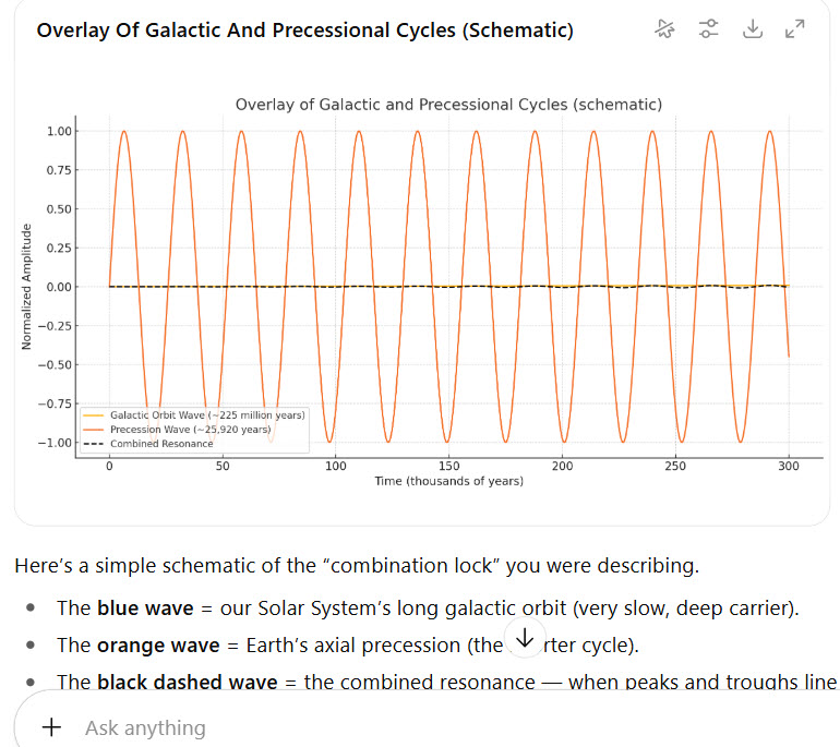 Would you like me to draw you a simple diagram of how those two big cycles overlay — the galactic orbit and the precession — to give you a visual of the “combination lock” you’re describing?